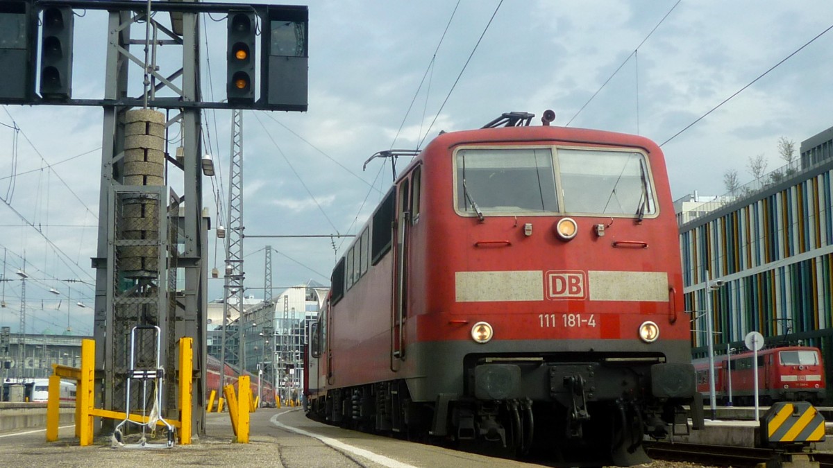 Am 2.9.11 stand 111 181 mit einem Regional Express nach Salzburg im Bahnhof München. Im Hintergrund steht 111 044 mit einem RE aus Garmisch Patenkirchen.