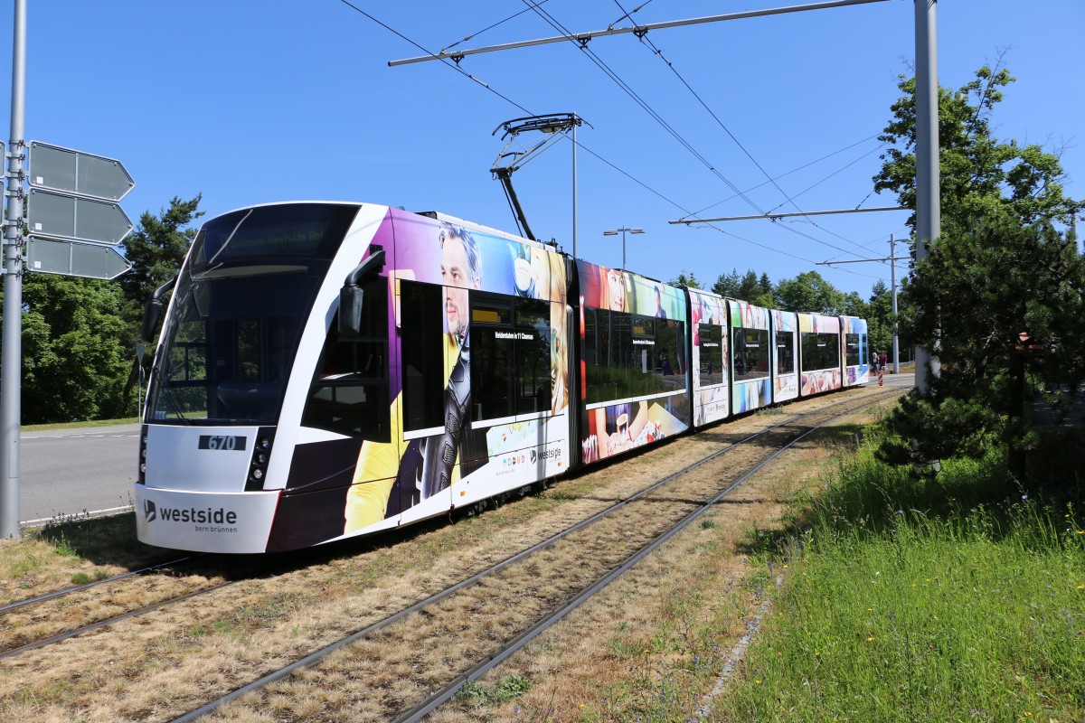 BERNMOBIL Combino Classic 670 mit Westside-Werbung kurz nach dem Verlassen der Haltestelle Holenacker. 21.06.2014