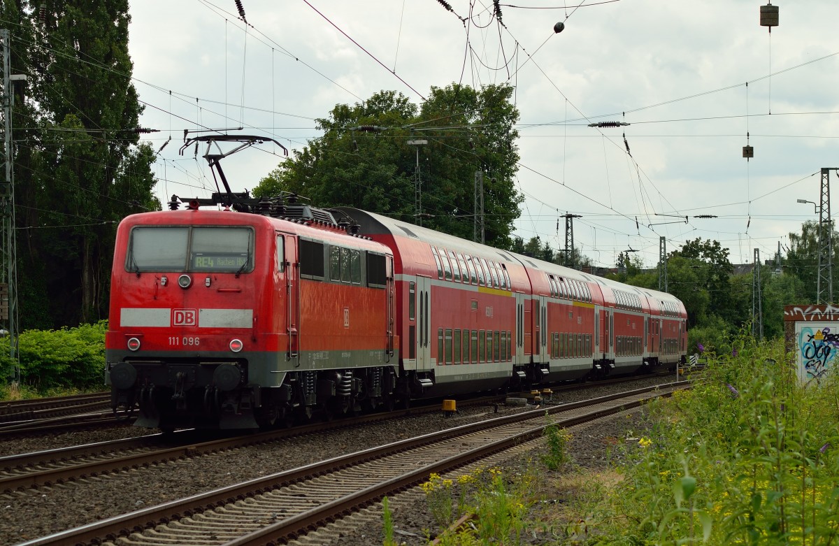 Gerade verlässt eine RE4 den Rheydter Hbf, der von der 111 096 geschoben wird. Am heutigen Samstag fahren die Züge nur zwischen Mönchengladbach und Aachen. 21.6.2014