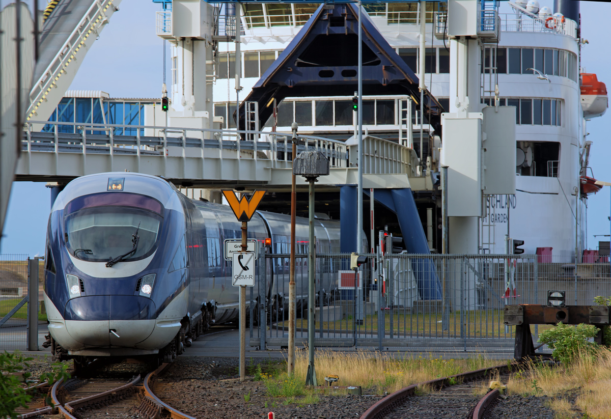 ICE-TD verlässt in Schrittgeschwindigkeit die Scandlines Fähre „Deutschland“ und fährt an den Bahnsteig in Puttgarden. - 20.06.2014