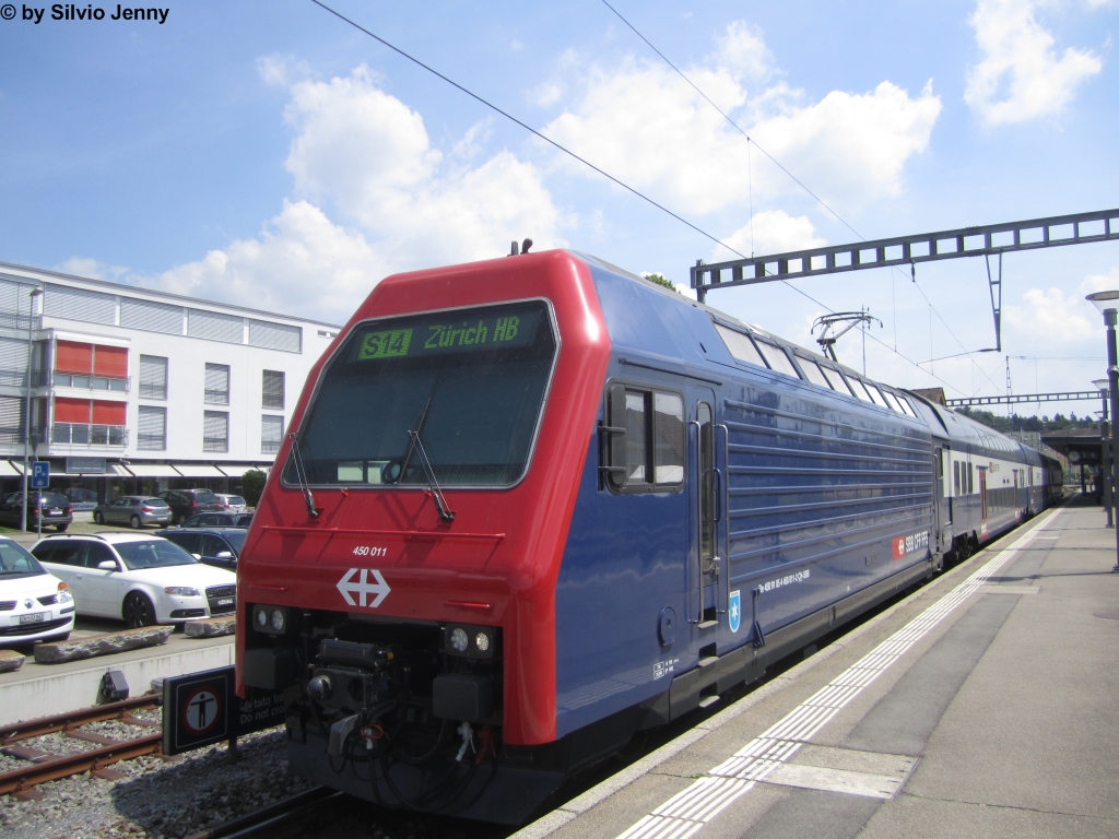 Re 450 011 ''Oberrieden'' am 18.6.2014 in Hinwil als S14 nach Zürich HB. Seit dem 15.6.2014 verkehren wieder DPZ auf der S14, da die bisher dort eingesetzten DTZ nun auf der S5 und S24 benötigt werden.