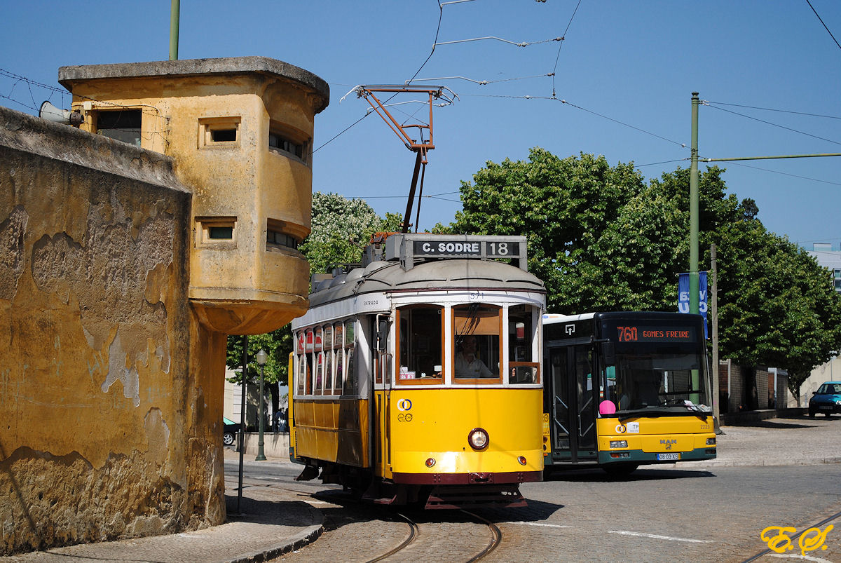 Tw.571 bei der Ausfahrt aus der Wendeschleife Ajuda. Der Turm links im Bild dient nicht der Verkehrsaufsicht, sondern ist ein Wachturm des Stützpunktes der republikanischen Nationalgarde GNR. (16.06.2014)