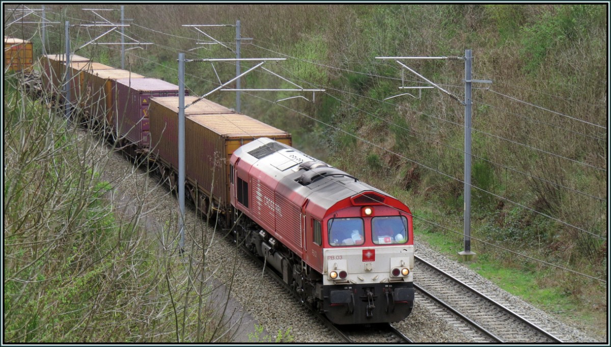 Mit einem Containerzug kommt die Crossrail 145 103-8 alias 145 CL 031 durch den Rheydter Hbf gen Aachen gefahren am Samstag den 21.6.2014