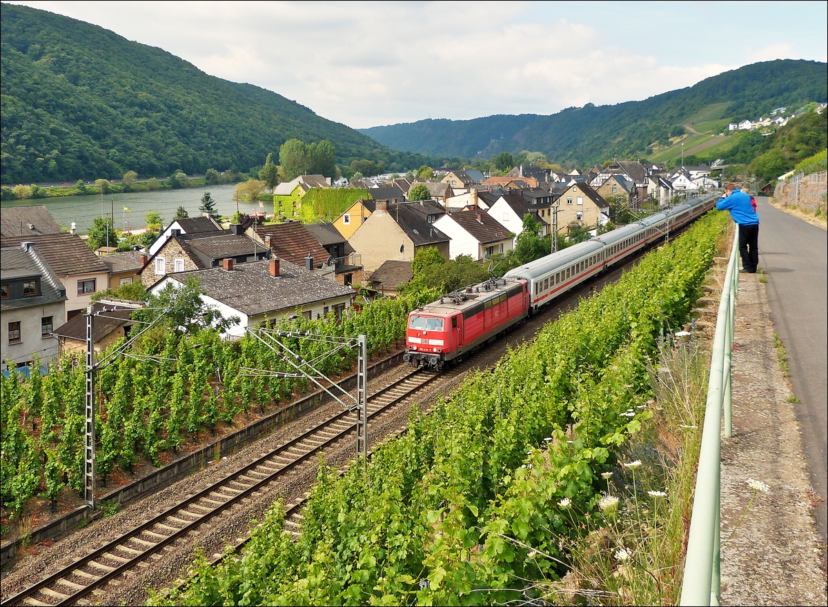 . Die 181 219-7 zieht den IC 133 "Ostfriesland" Luxemburg - Norddeich Mole durch den wunderschönen Moselort Hatzenport und wird von mehreren BB Fotografen abgelichtet. 21.06.2014 (Hans)