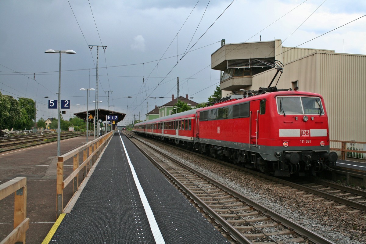 111 061 mit einer RB von Schliengen nach Offenburg am Nachmittag des 25.04.14 bei der Einfahrt in Müllheim (Baden).