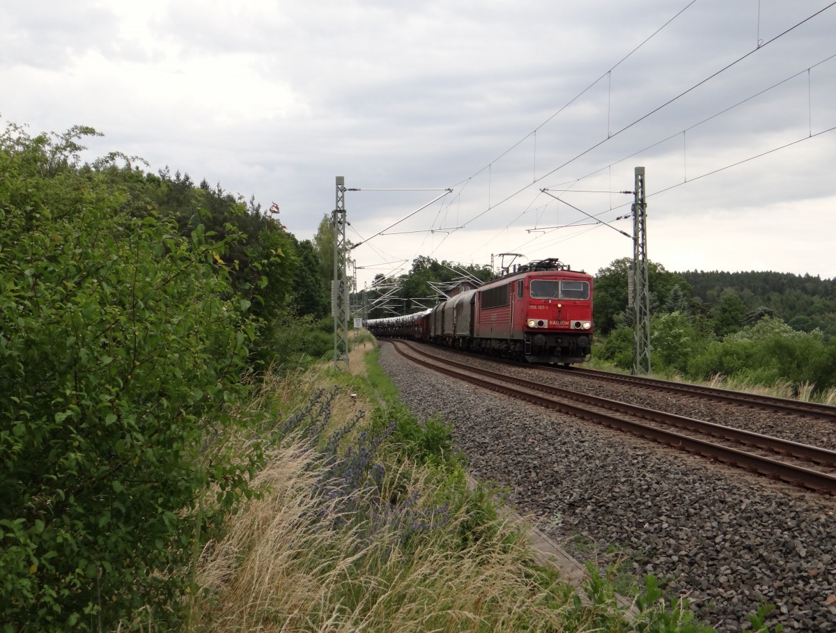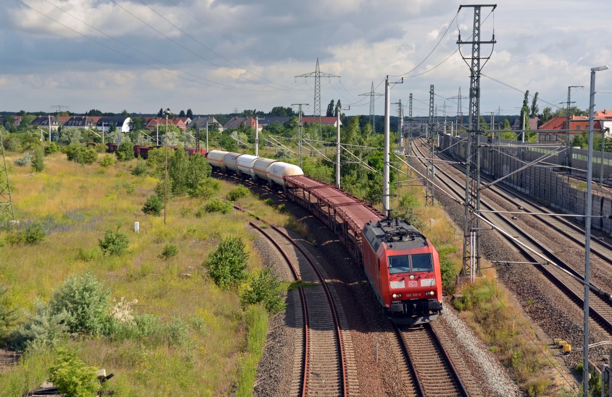 185 150 führte am 22.06.14 einen aus Richtung Dessau kommenden Mischer durch Bitterfeld.