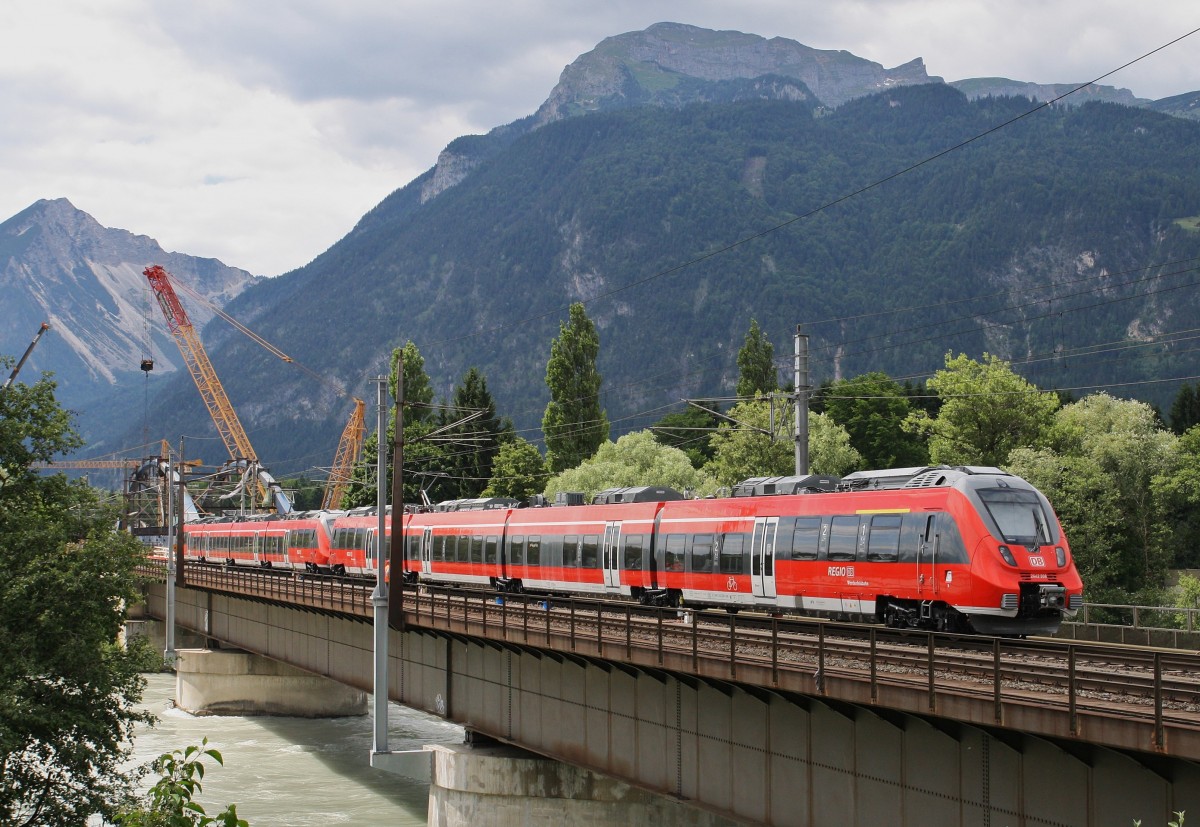 Am Nachmittag des 17.6.2014 überquert der Talent 2 442 208 (Zweiteilig, mit Österreichzulassung) der DB Regio ``Werdenfelsbahn`` die Innbrücke bei Brixlegg Richtung Innsbruck. Komplett Neu und noch nicht für den Personenverkehr zugelassen. Die Sitze waren noch in Folie gehüllt und der Einstieg ist durch Hinweisschilder untersagt. Wahrscheinlich fährt er in Zukunft von Innsbruck nach München, aber über die Karwendelbahn (Garmisch-Partenkirchen).