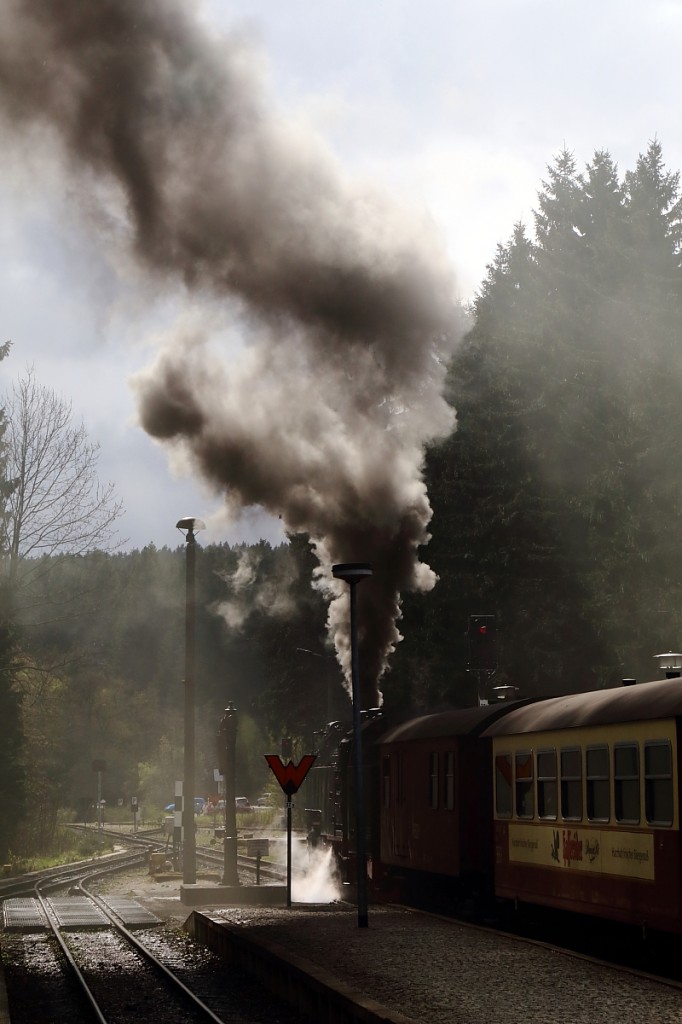 Ein Zug zum Brocken, mit 99 7241 an der Spitze, am Nachmittag des 15.04.2014, kurz vor Ausfahrt, im Bahnhof Drei Annen Hohne. Besonders interessant fand ich hier das durch die Rauchwolke der Lok verursachte Licht/Schatten-Spiel.