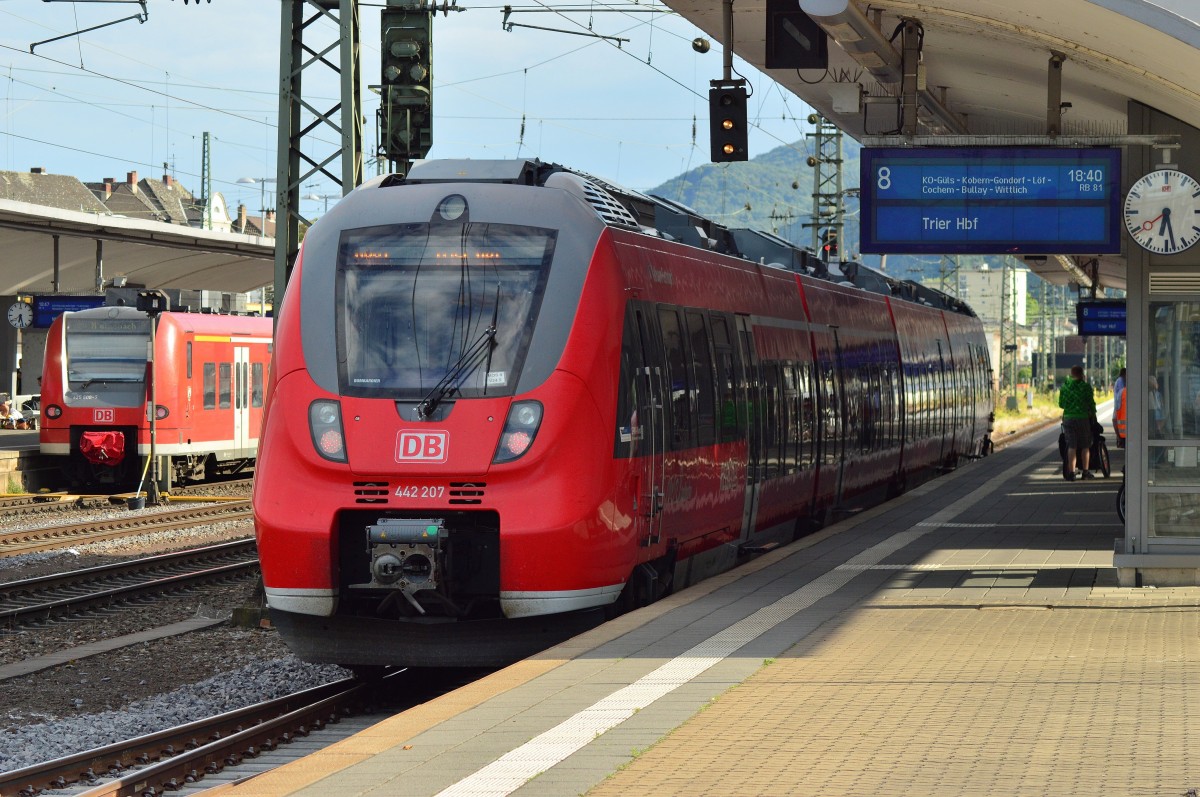 . Wunderschönes Moseltal - Auf der Moselbrücke in Löf bekommt man einen tollen Einblick ins Moseltal mit seinen herrliche Ortschaften und romatischen Burgen. Rechts im Bild erstreckt sich der Ort Alken mit der Burg Thurand, während links der RE 12011 (Mosel-Saar-Express) Koblenz Hbf - Saarbrücken Hbf die Moselstrecke zwischen Kattenes und Löf befährt. 20.06.2014 (Jeanny)