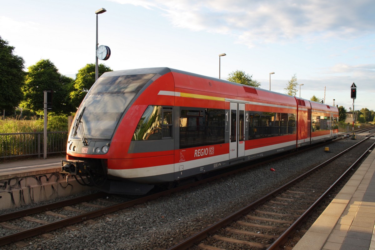 Am 14.06.2014 hält der VT 872 des Hex im Bahnhof von Langenstein an der Strecke Blankenburg-Halberstadt auf seinem Weg nach Magdeburg Hbf
