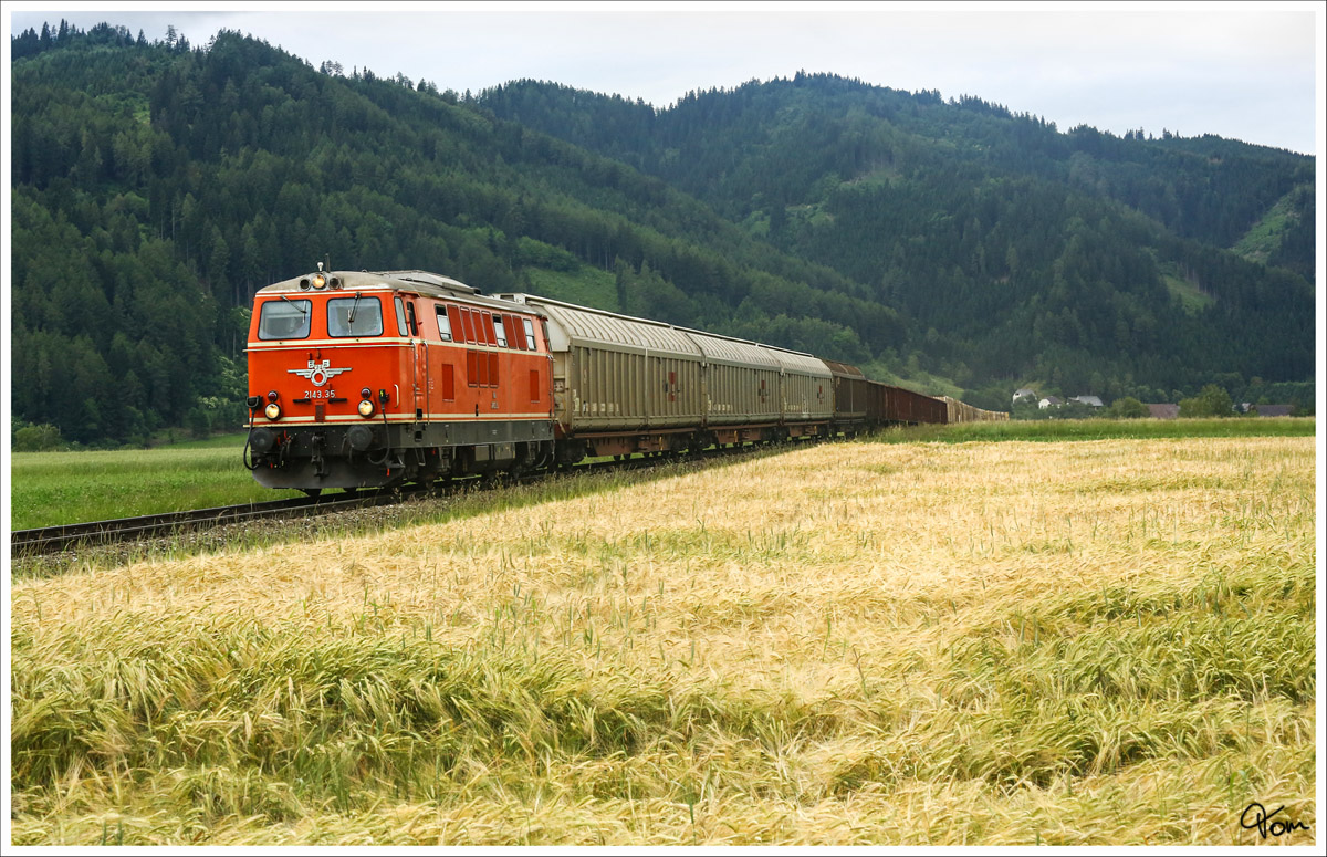 Vorbei an den Getreidefeldern nahe Wasendorf, rollt 2143.035 mit dem Leerzug 63515 von Pöls nach Zeltweg.
