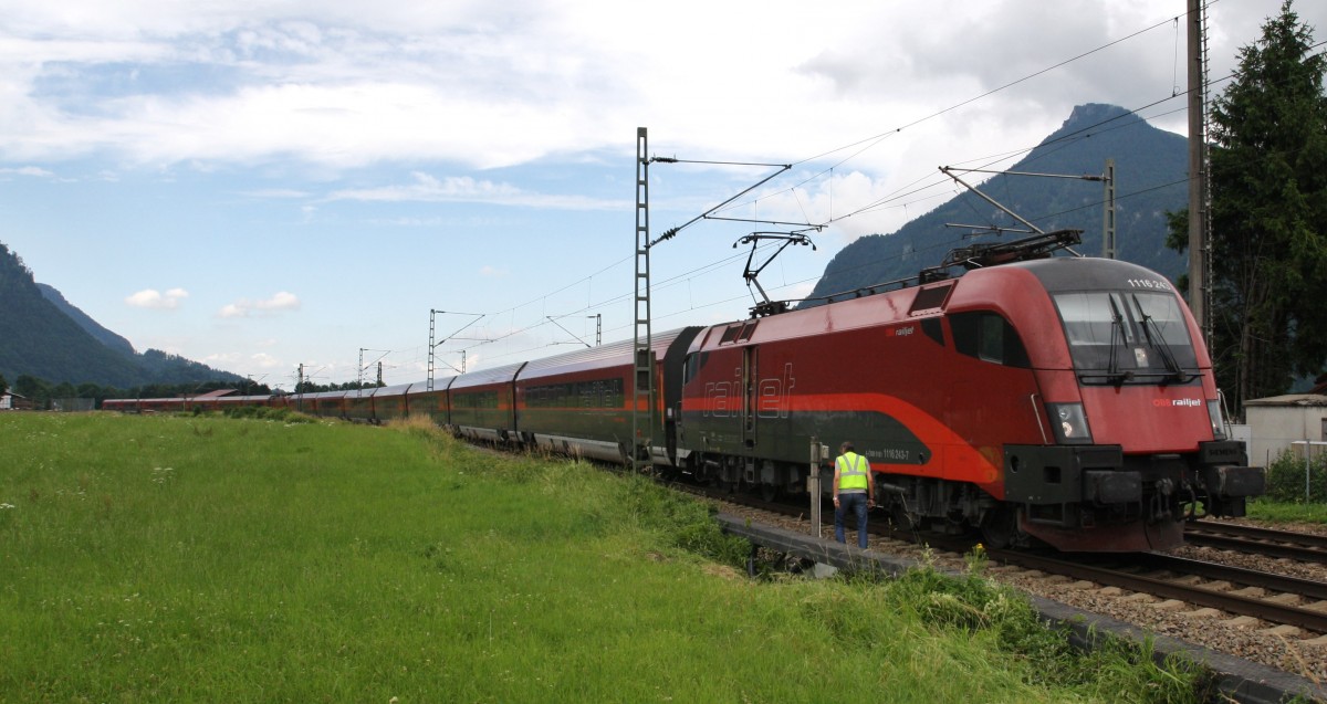 Zwangsstop für 1116 243-7 mit Railjet 564 Wien West-Innsbruck am BÜ Niederaudorf, kurz vor Kufstein. Durch einen Stellwerkfehler in Tirol(Wörgl) war auch am Nachmittag des 24.6.2014 der Bahnübergang in Niederaudorf betroffen. Der Triebfahrzeugführer des Railjets musste den BÜ per Hand sichern. Die Schranken blieben für gut 40 min geschlossen.