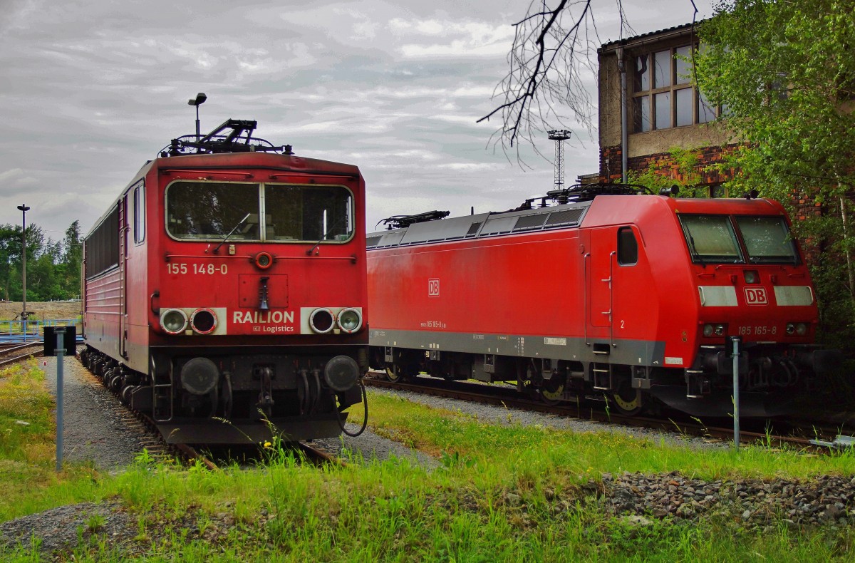 155 148-0 und 185 165-8 stehen am 13.06.14 auch in der Einsatzstelle von Engelsdorf/S. Bild wurde von einen öffentlichen Gelände gemacht.