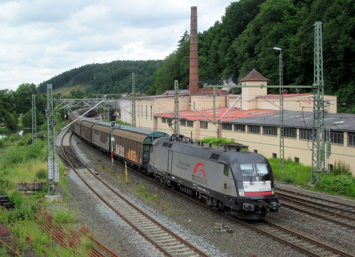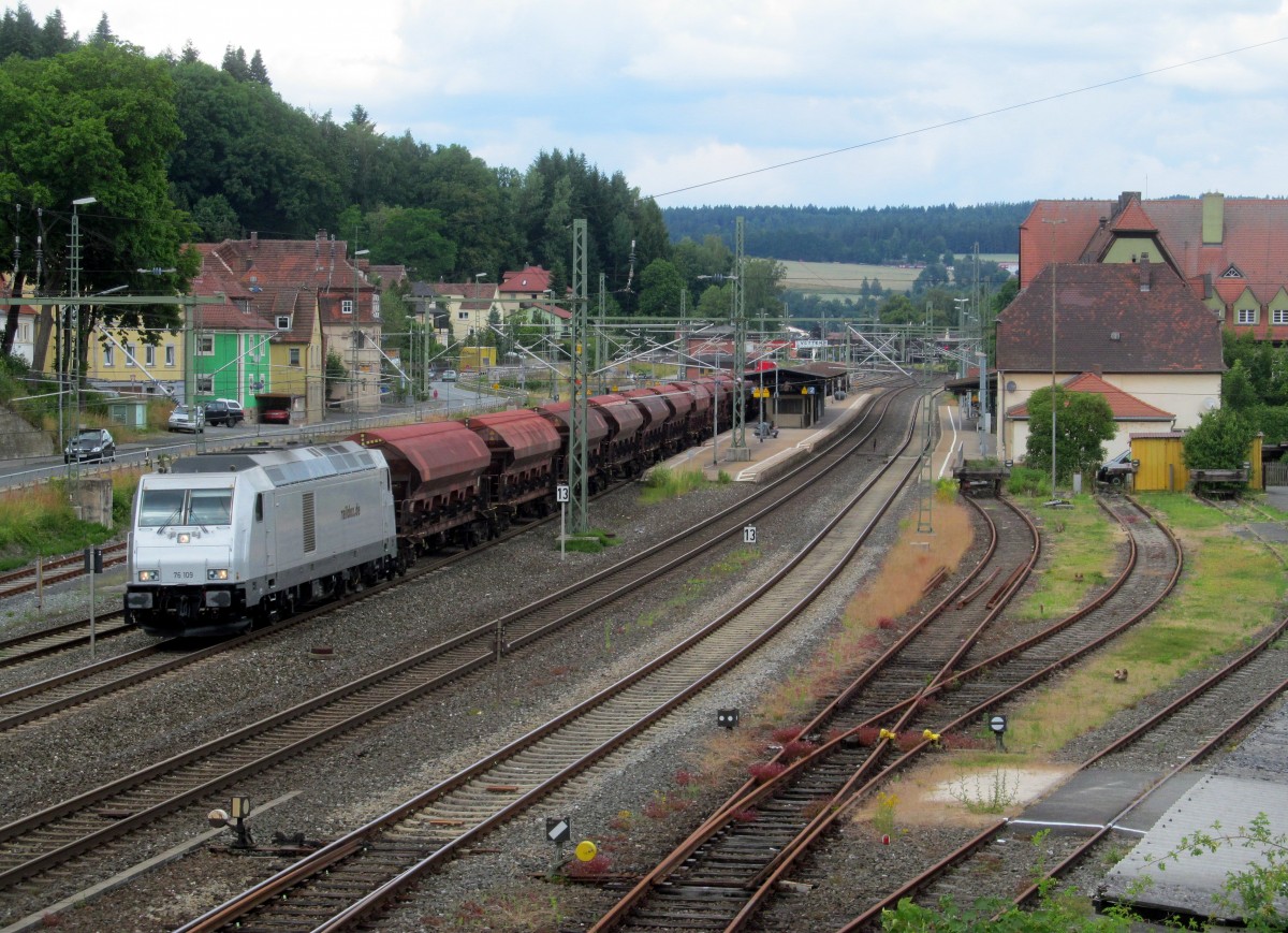 185 152-6 "K+S" zieht am 25. Juni 2014 einen gemischten Güterzug durch Kronach in Richtung Lichtenfels.