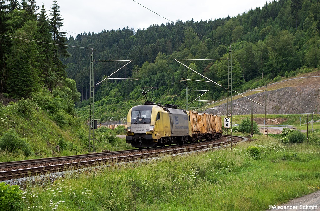 Die ES 64 U2 027 "ÖKOSTROM" sowie die 1216 950 waren am 08.06.2014 mit dem WLC-Güterzug 47698 unterwegs, und wurden von mir auf der "Steinbauerwiese" bei Eichberg fotografiert.