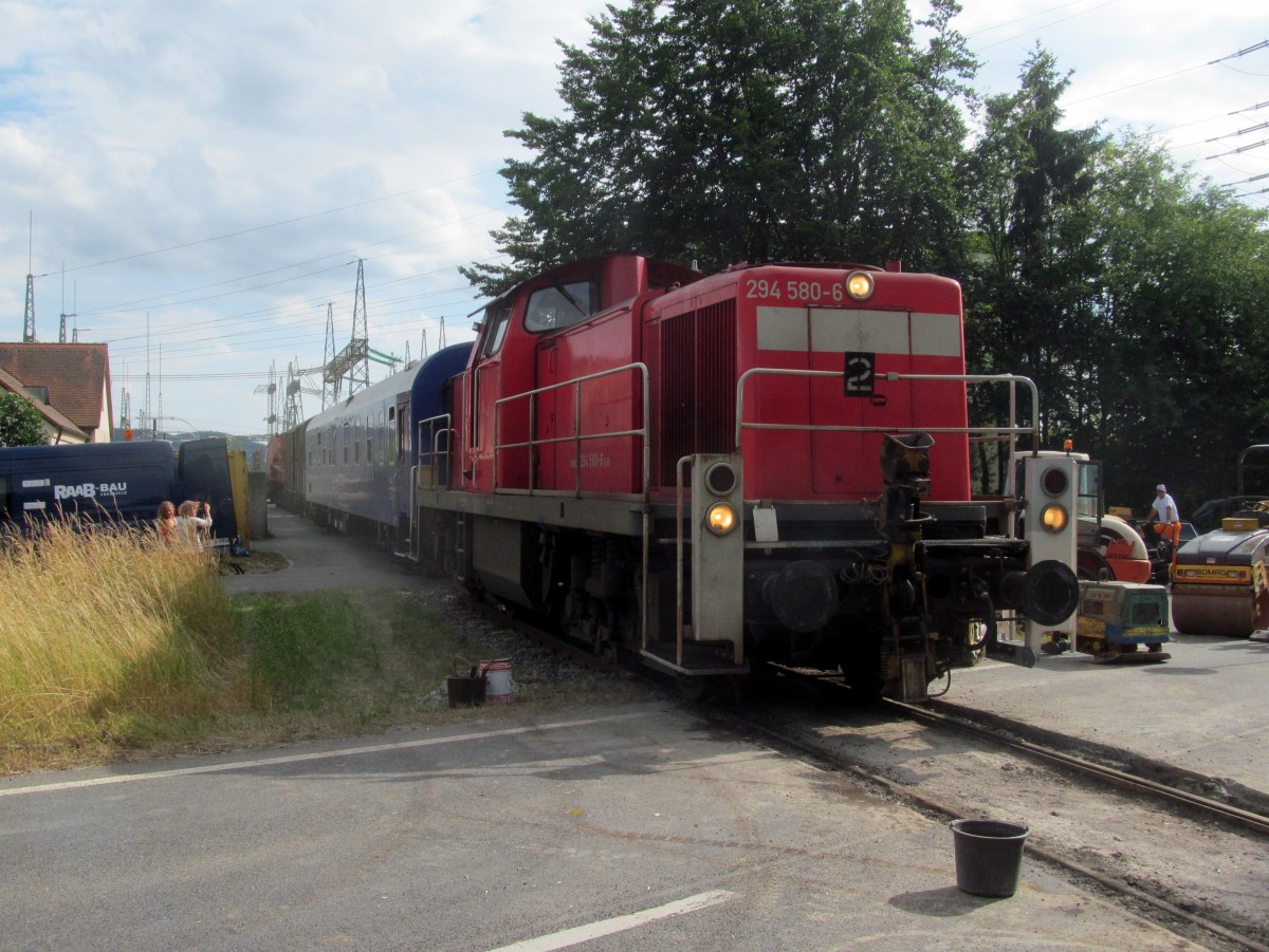 294 580-6 verlässt am 22. Juni 2014 mit einem leeren Trafotransport das Umspannwerk Redwitz (Rodach) in Richtung Kronach.