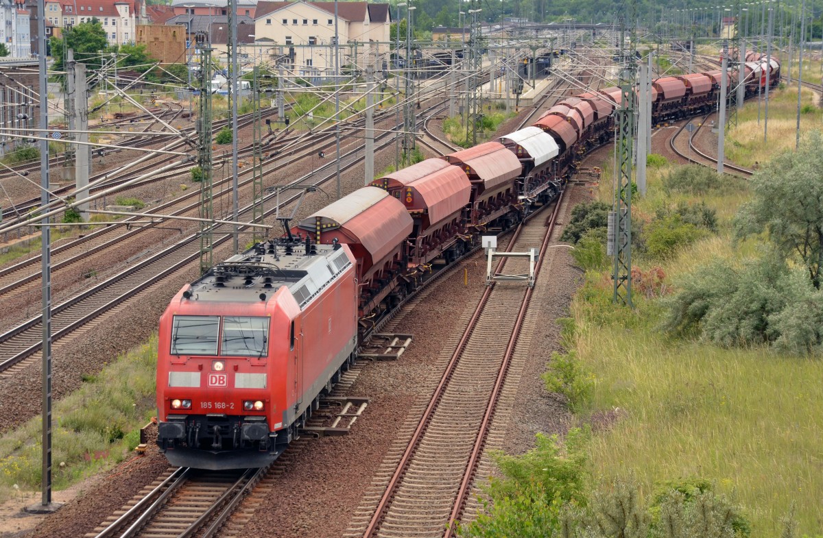 Am 15.06.14 verließ 185 168 mit einem langen Schwenkdachwagenzug den Bitterfelder Bahnhof Richtung Dessau.