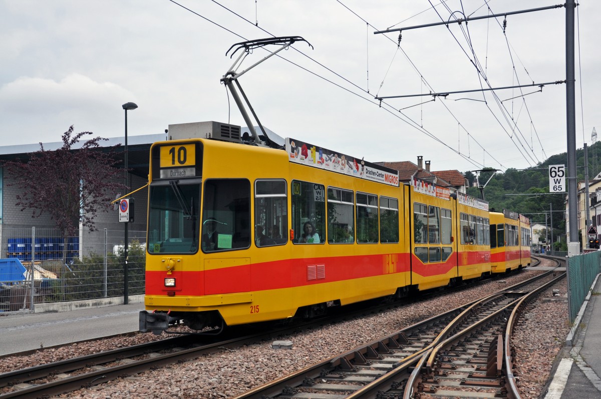 Be 4/8 215 zusammen mit dem Be 4/6 258 auf der Linie 10 kurz nach der Haltestelle Münchenstein Dorf. Die Aufnahme stammt vom 17.06.2014.