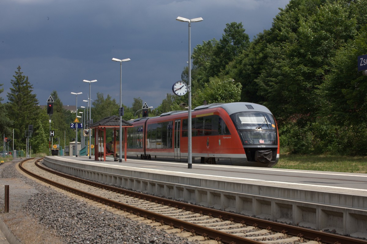 Blick auf den modernisierten Bahnhof Zschopau, der von einem TW der Erzgebirgsbahn bedient wird. 27.06.2014 13:43 Uhr.