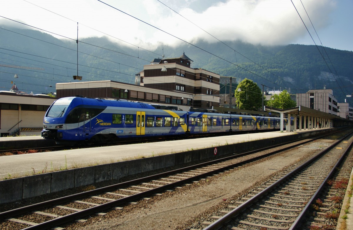 Ein ETR 610 als Eurocity 32 auf der Fahrt von Milano nach Genf, beim Château de Chillon.