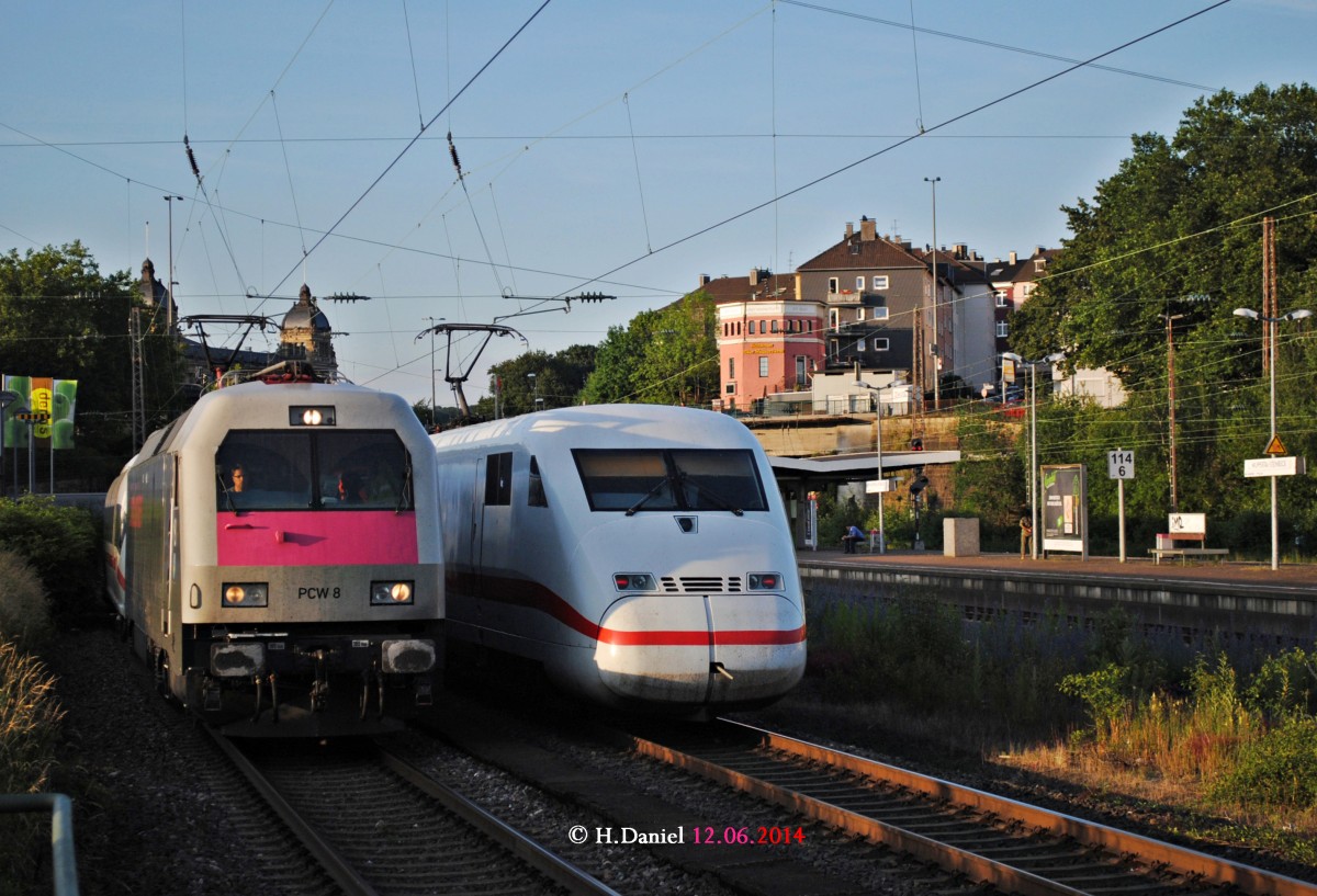 Eurosprinter PCW 8 (127 001) mit einem ICE Velaro D im Schlepp und daneben ICE 402 am 12.06.2014 in Wuppertal Steinbeck.
