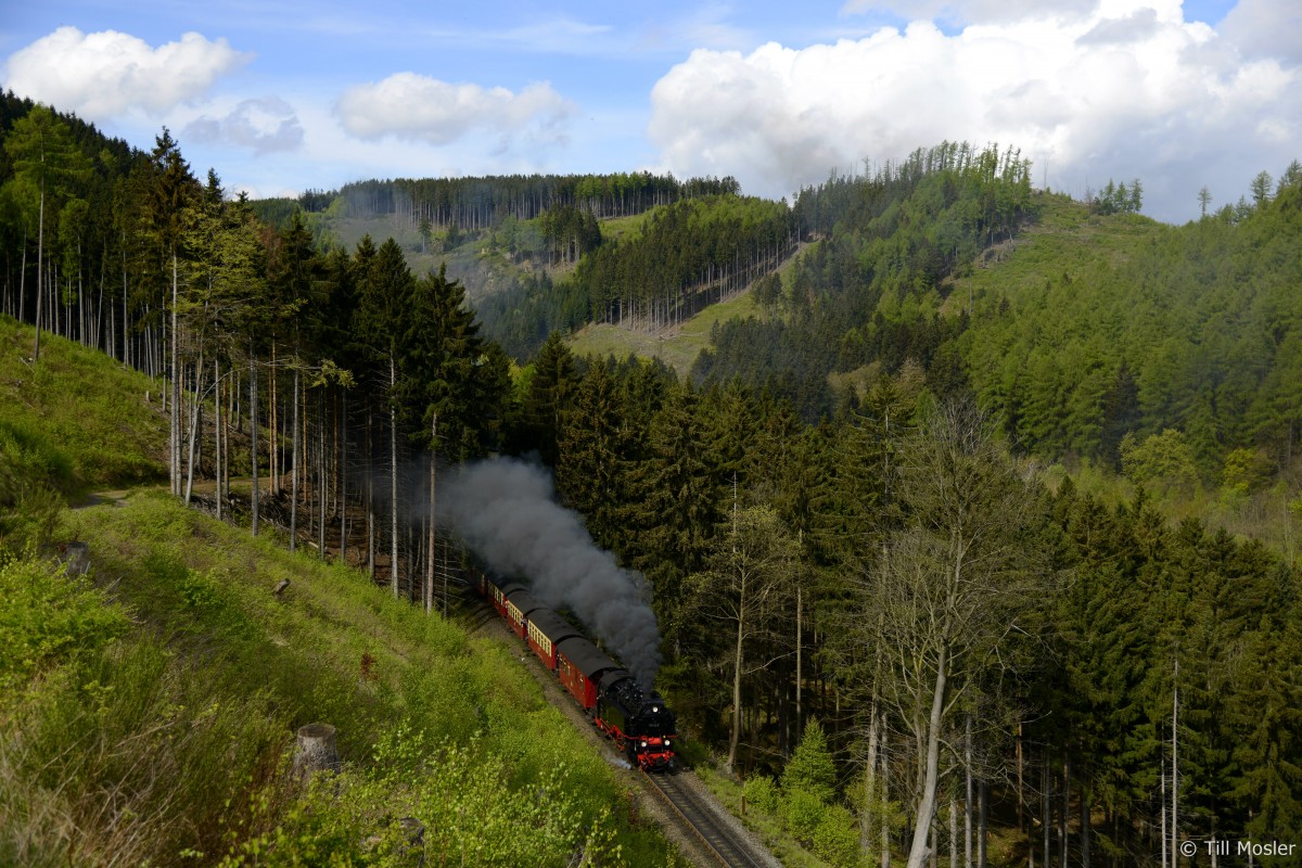 Für kurze Zeit wird täglich die Idylle nahe dem Brocken durch das Stampfen der bergwärts fahrenden Dampfloks der Baureihen 99 unterbrochen. Hier zieht Lok 99 222 einen der Züge gen Brocken.
