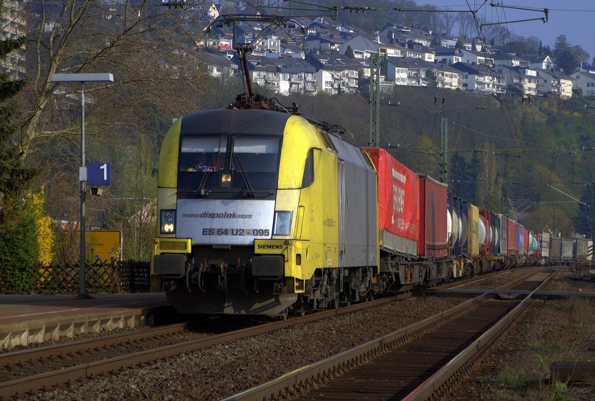 MRCE Dispolok ES 64 U2-095 (182 595), vermietet an TX Logistik, durchfährt am 06.04.12 mit einem KLV-Zug den Bahnhof Vallendar in Richtung Köln.