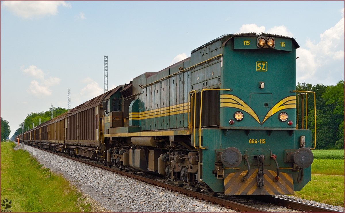 SŽ 664-115 zieht Güterzug durch Cirkovce-Polje Richtung Koper Hafen. /3.6.2014