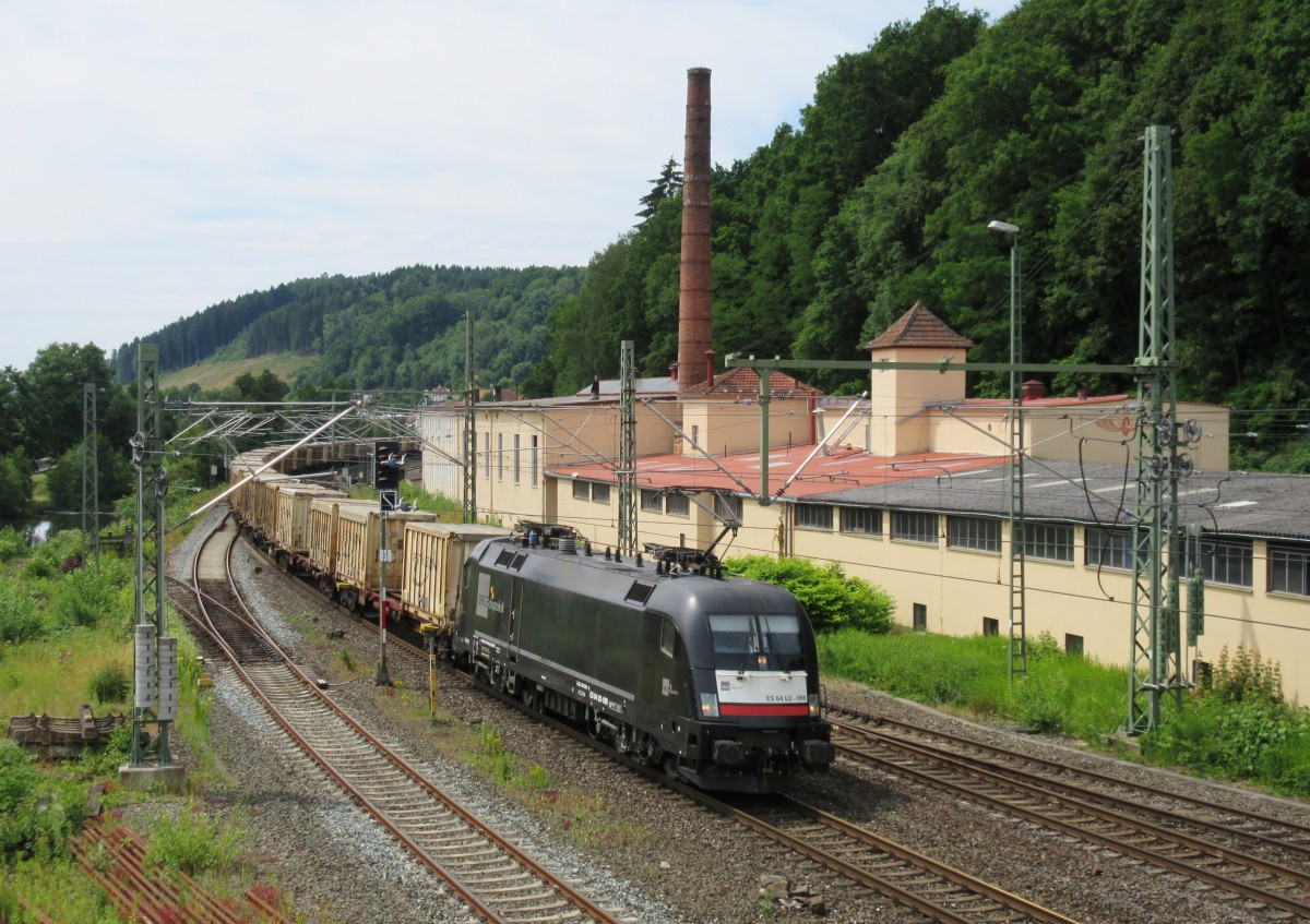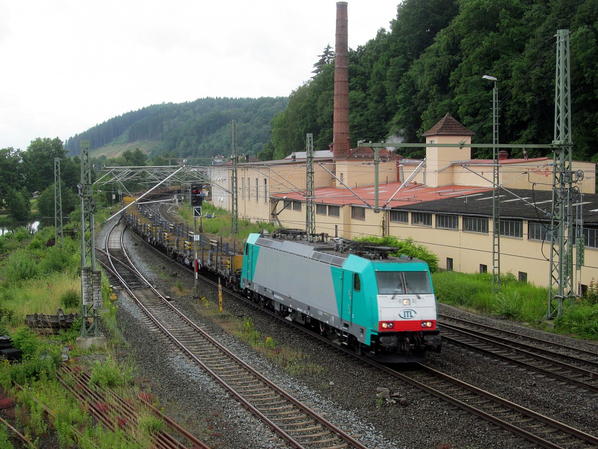 186 127 von ITL zieht am 25. Juni 2014 einen leeren Langschienenzug durch Kronach in Richtung Saalfeld.