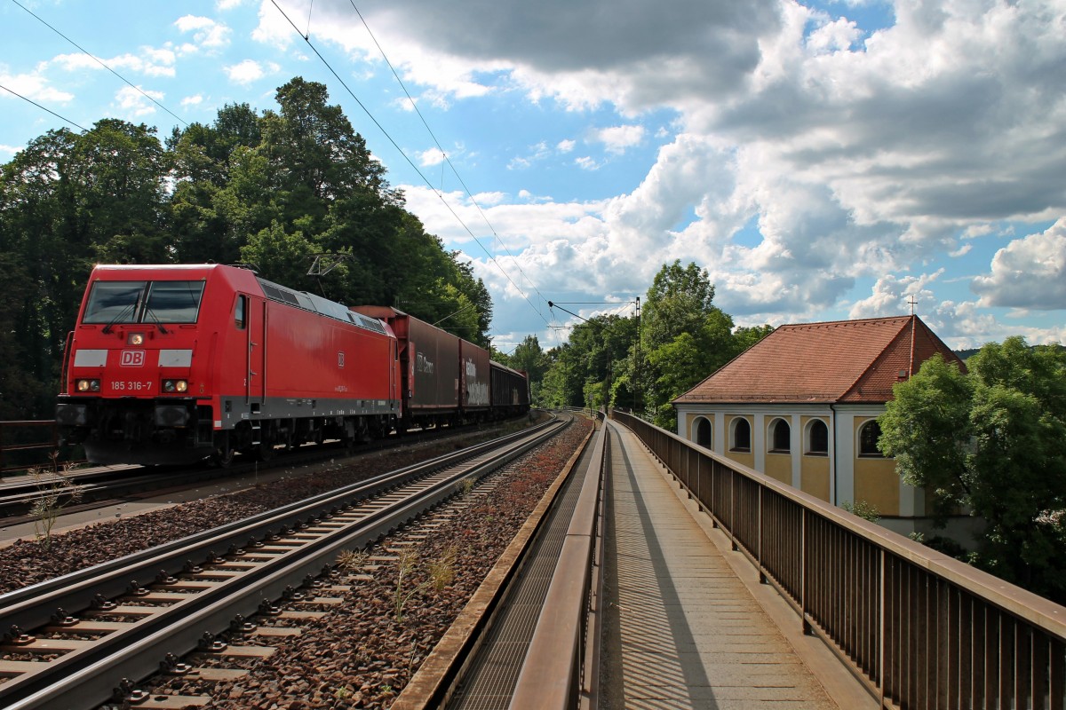 185 316-7 am 25.06.2014 mit einem Autoteilezug beim überqueren der Donaubrücke bei Mariaort in Richtung Regensburg. Rechst im Bild ist die Kalvarienkapelle von Mariaort zu erkennen.