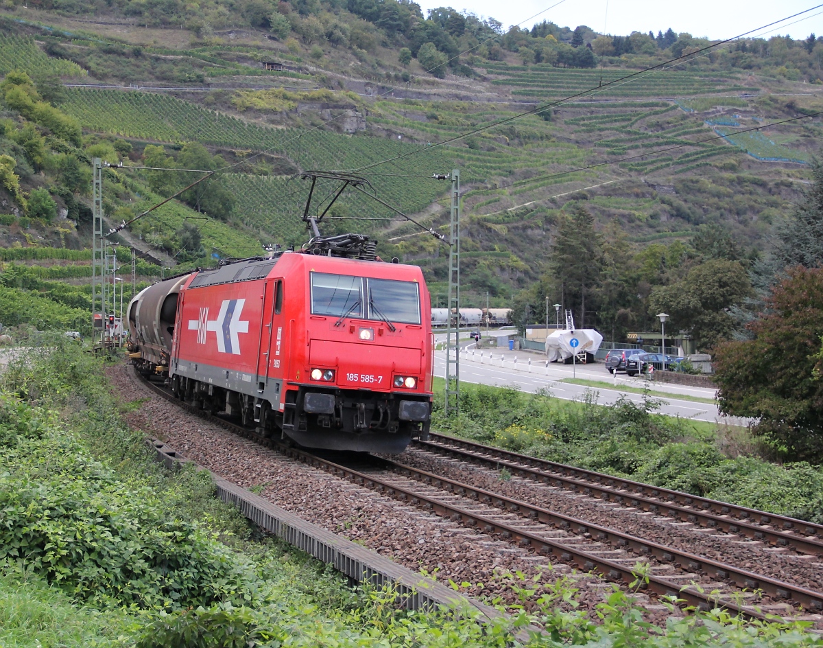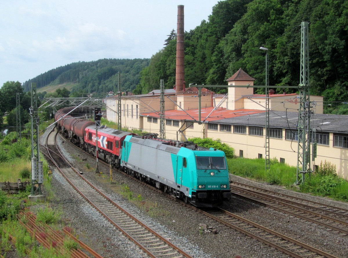 185 618-6 der HGK zieht am 28. Juni 2014 die 266 070-2 der HGK und einen Kesselwagenzug durch Kronach in Richtung Saalfeld.