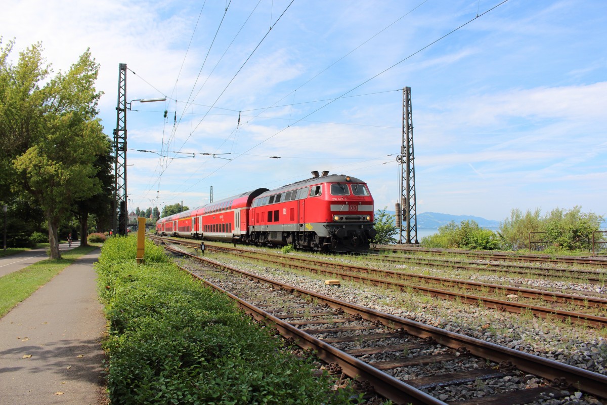 28.06.2014; 218 427 verlässt mit ihrem IRE nach Stuttgart Hbf den Bahnhof Lindau