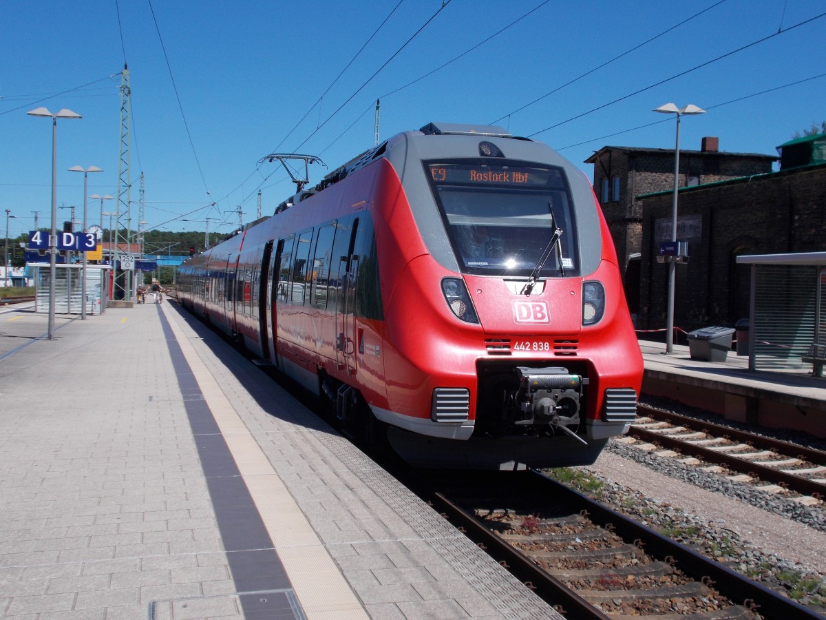 Am 14.Juni 2014 hielt der Rostocker Talent2 442 838,als RE 13010 Sassnitz-Rostock,in Bergen/Rügen.
