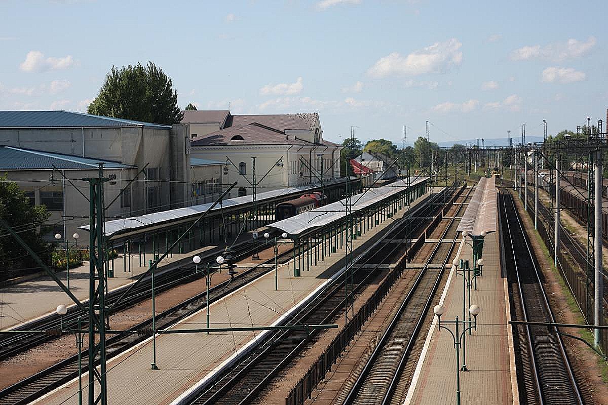 Blick am 1.10.2009 von der Fußgängerbrücke auf die Bahnsteige und das Bahnhofsgebäude des Grenzbahnhofes Tschop in der Ukraine. Links ist vor dem Bahnhofsgebäude gerade der Personenzug der MAV nach Ungarn zu erkennen. Die Strecke nach Ungarn verläuft hier als Normalspurgleis und zweigt in Blickrichtung hinter dem Bahnhof nach links ab zur ungarischen Grenze. Geradeaus geht es in Blickrichtung zur slowakischen Grenze. Wer möchte, kann das ja mal bei Google Earth selbst nachvollziehen und sich anschauen.