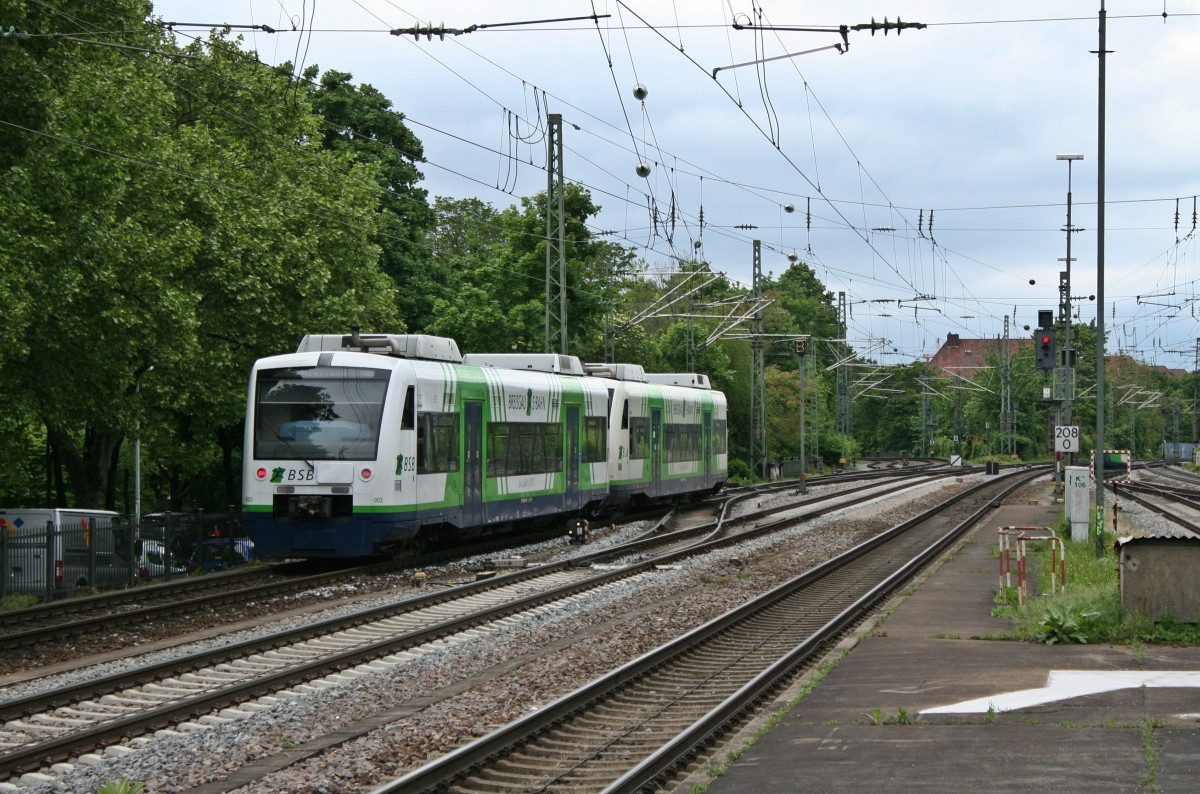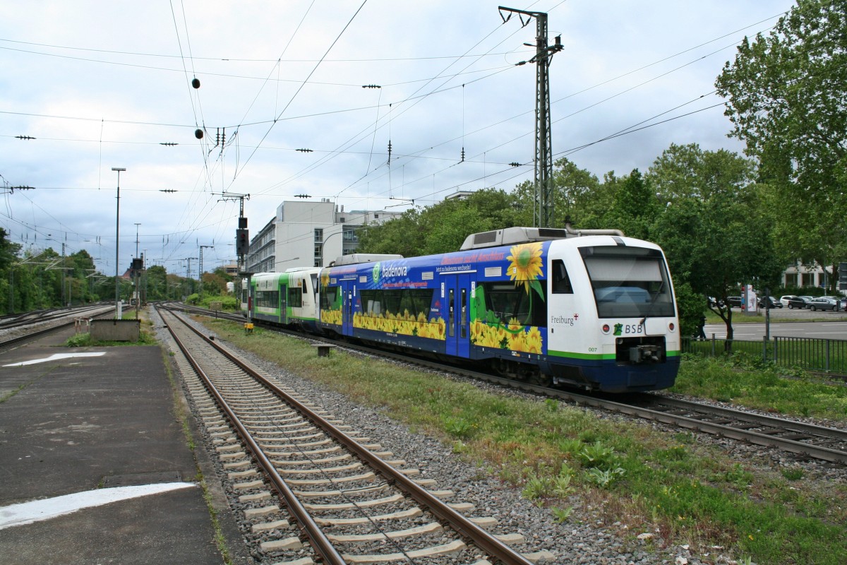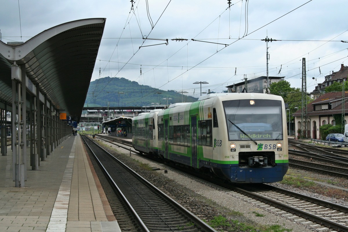 BSB-VT002 und BSB-VT 009 auf dem Weg nach Breisach beim Verlassen des Abgangsbahnhofs Freiburg (Breisgau) Hbf.