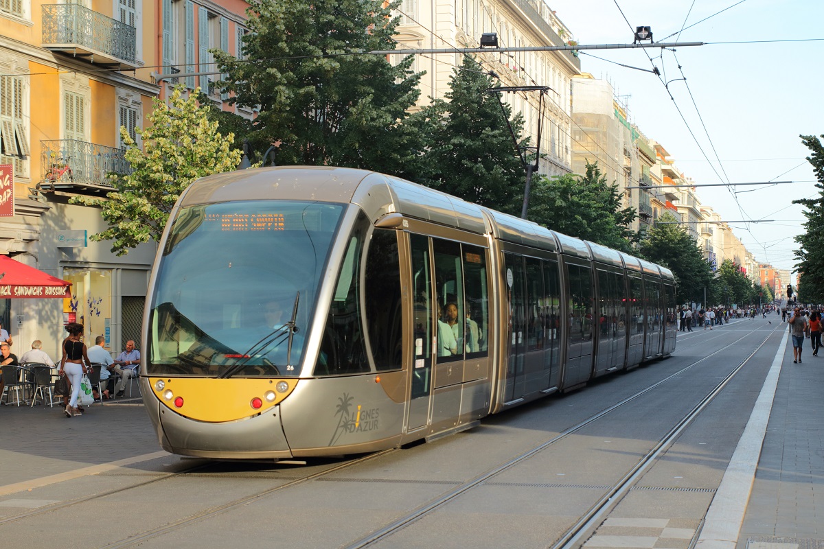 Triebwagen 01 und 16 der Straßenbahn Nice/Nizza begegnen sich am 07.06.2014 am Hauptbahnhof. Nachdem die letzte meterspurige Linie 1953 eingestellt wurden, begann dort mit der Eröffnung am 26.11.2007 ein neues (normalspuriges) Straßenbahnzeitalter. Momentan verkehrt nur die Linie 1 mit 8,2 km Länge, es gibt jedoch Ausbaupläne, bis 2019 soll die Netzlänge 28 km betragen. Für zwei kurze oberleitungslose innerstädtische Streckenabschnitte sind die Fahrzeuge vom Typ Citadis 302 (01-13) und 402 (14-28) auch mit einem Batterieantrieb versehen.