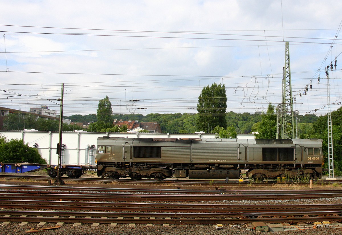 Die Class 66 DE6306 von DLC Railways fährt mit einem langen Bulkhaul-Ganzzug-Containerzug aus Melzo(I) nach Zeebrugge-Ramskapelle(B) bei Ausfahrt aus Aachen-West und fährt in Richtung Montzen/Belgien. Aufgenommen vom Bahnsteig in Aachen-West bei Wolken am Abend vom 13.6.2014.