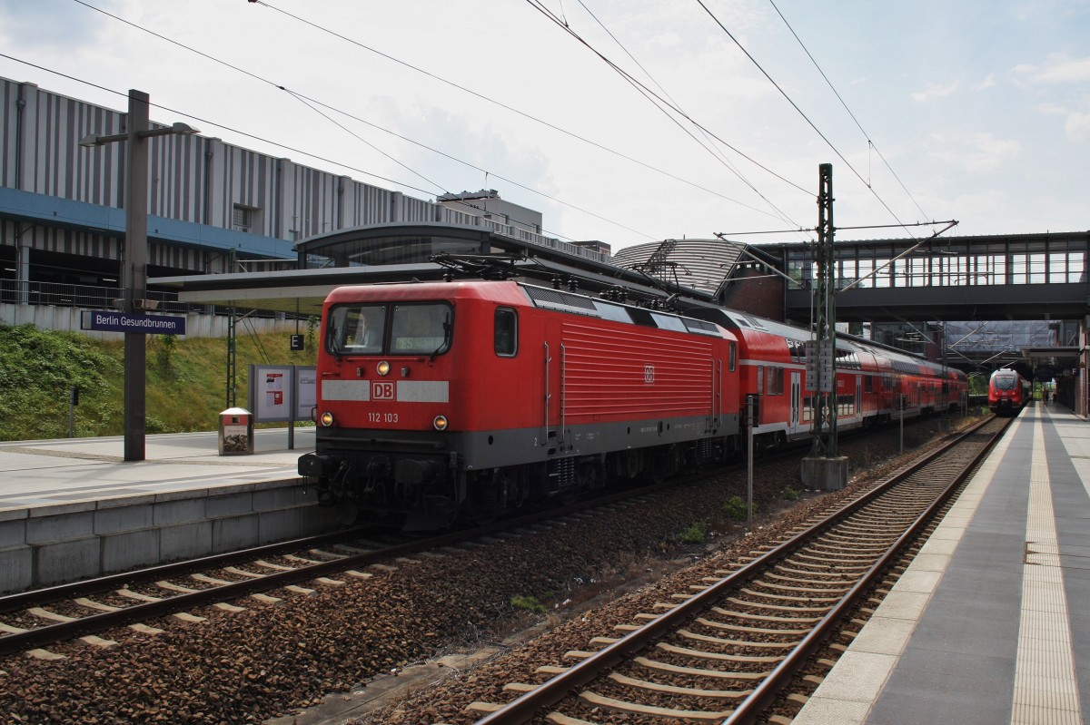 Hier 112 103 mit einem RE5 (RE4360) von Lutherstadt Wittenberg nach Rostock Hbf., bei der Ausfahrt am 27.6.2014 aus Berlin Gesundbrunnen.