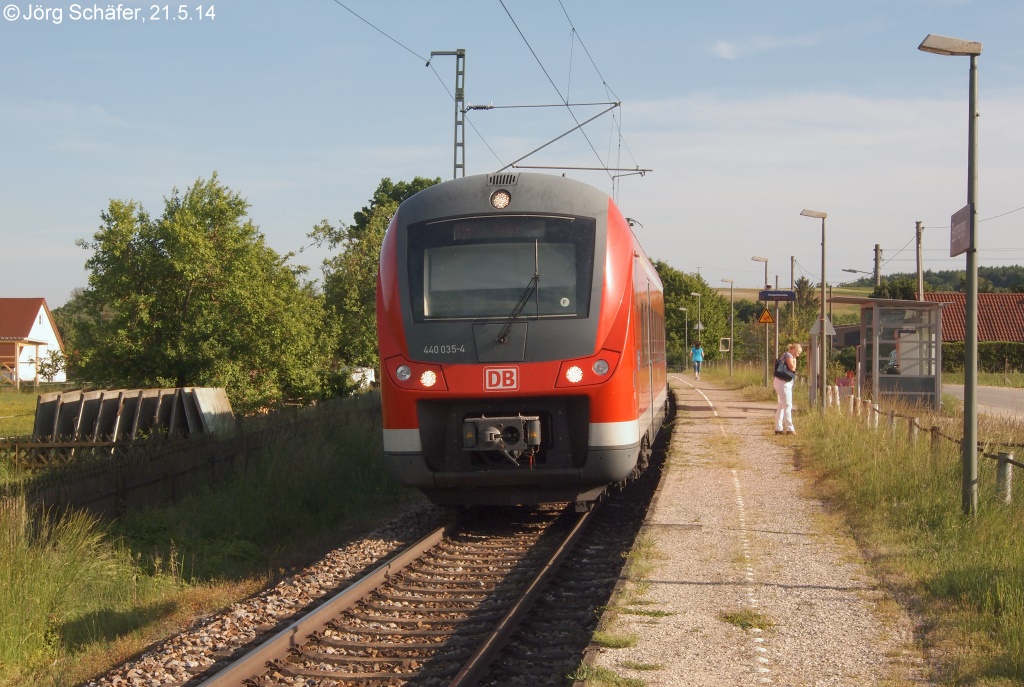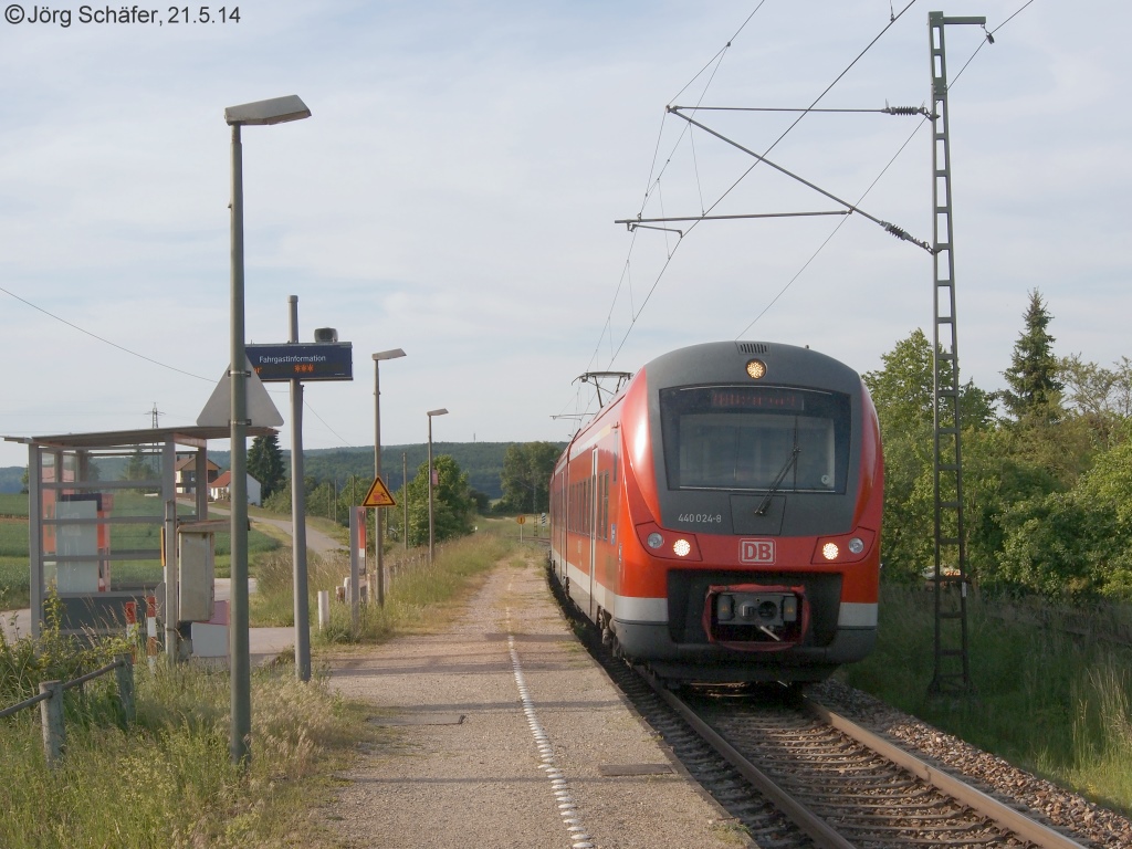 440 035 fuhr am 21.5.14 als RB nach Aalen in den Bahnhof Wörnitzstein ein. Dieser hat zwei Gleise und zwei Bahnsteige, die jeweils in Fahrtrichtung hinter der handbedienten Schranke liegen.