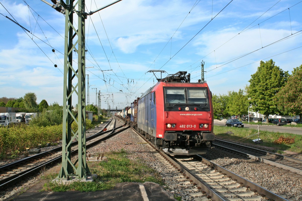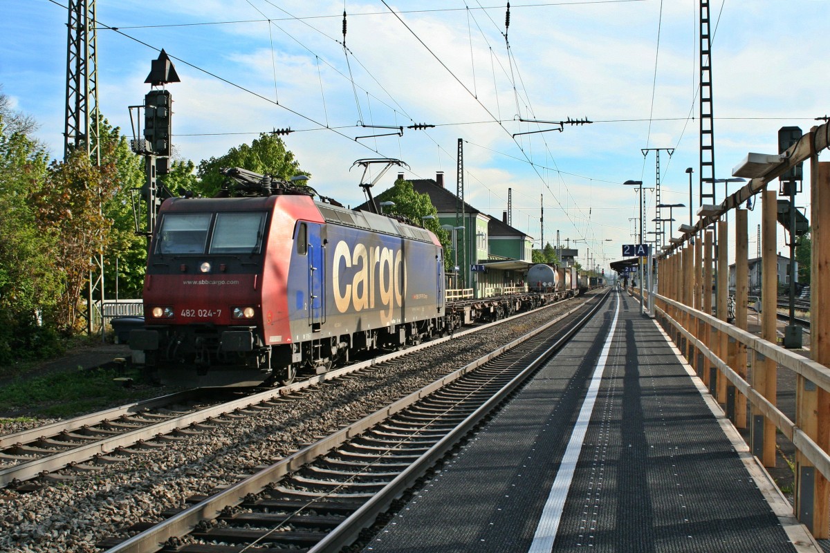 Ausfahrt am 28.05.2014 von Beacon Rail/Crossrail 185 601-2 mit einem schweren Containerzug vom Überholgleis in Müllheim (Baden) in Richtung Heimat.