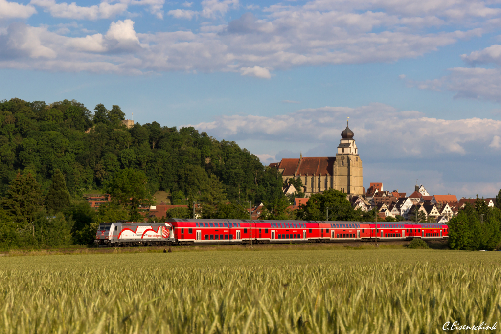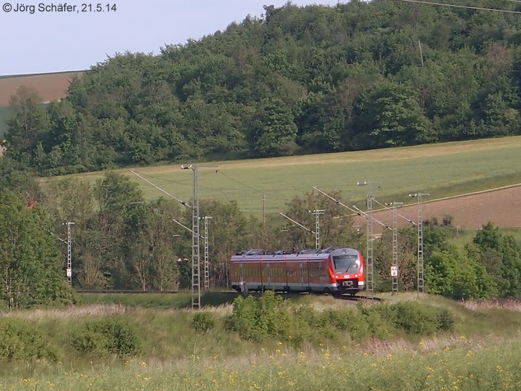 Eine RB nach Aalen hat vor etwa 5 Minuten Nördlingen verlassen, ist ins Wörnitztal abgebogen und steuert auf Wörnitzstein zu. (Blick nach Nordosten am 21.5.14)