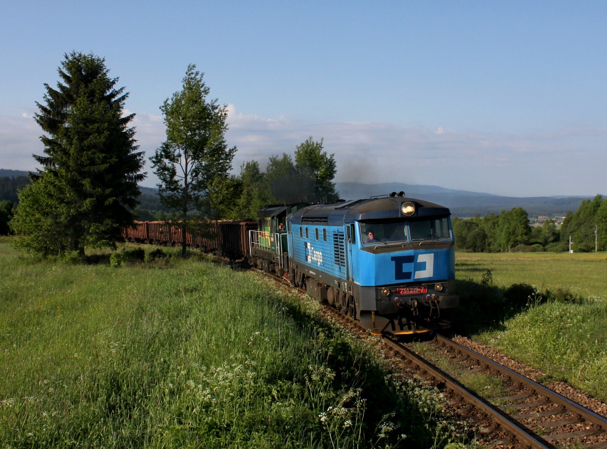 749 121 mit einem R nach Pribram am 25.05.2014 bei Breznice.
