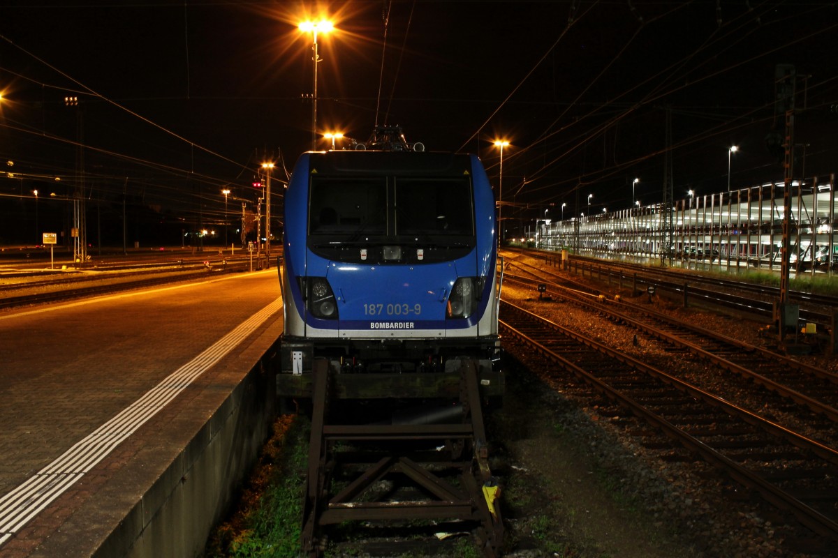 Frontansicht von Bomdardier 187 003-9 am frühen Morgen des 31.05.2014, als sie zusammen mit 187 006-2 von Railpool und der 139 558-1 in Basel Bad Bf abgestellt war.