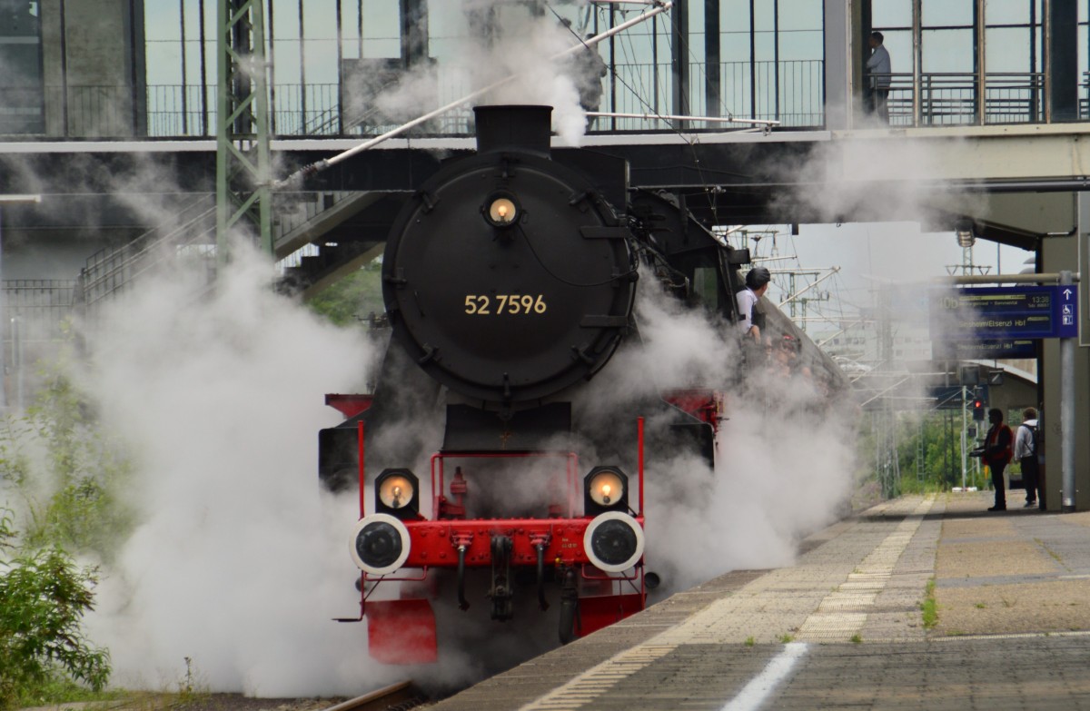 Hier hüllt sich die 52 7596 bei der Ausfahrt aus dem Heidelberger Hbf nach Sinsheim erst einmal in Dampfwolken....29.5.2014