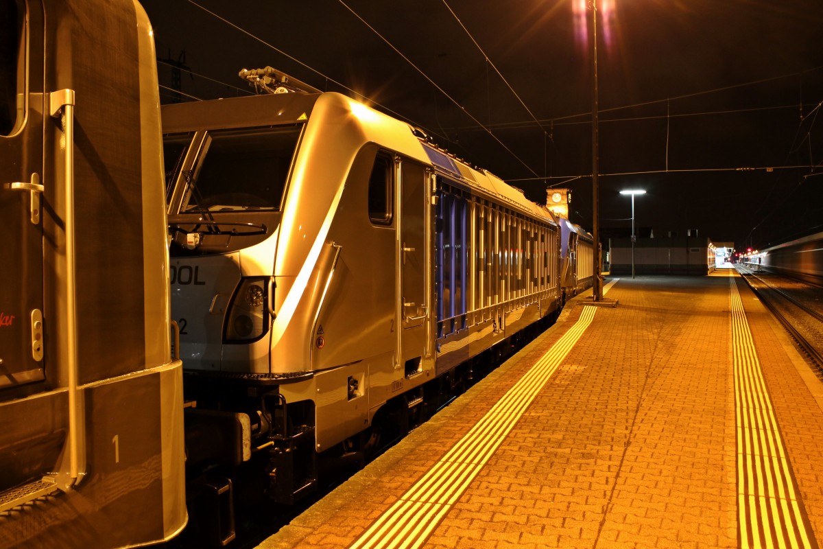 185 006-4 DB kommt durch Kohlscheid mit einem langen Audi-VW-Zug aus Osnabrück nach Kortenberg-Goederen(B) und fährt die Kohlscheider-Rampe hoch nach Aachen-West ujnd fährt in Richtung Richterich,Laurensberg,Aachen-West. Bei Regenwolken am Abend vom 12.5.2014.