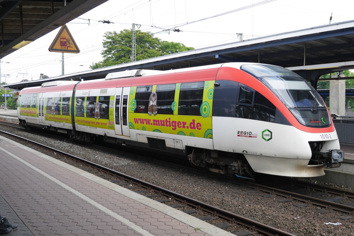 Zwei Euregiobahn (RB20) kommt aus Langerwehe-Stolberg-Altstadt nach Heerlen(NL) aus Richtung Aachen-West,Laurensberg,Richterich und hält in Kohlscheid und fährt in Richtung Herzogenrath bei Sonne und Wolken am Morgen vom 14.5.2014.