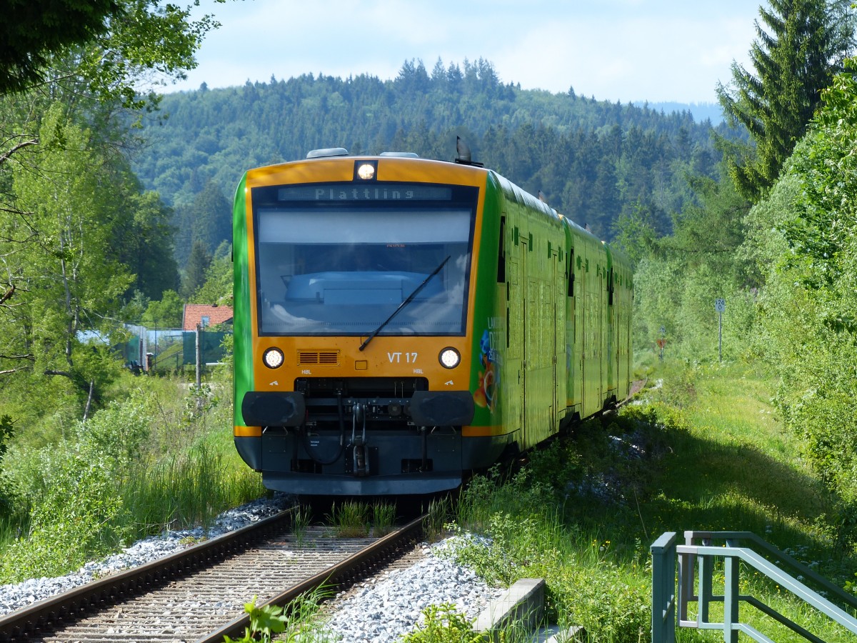 VT17 und zwei weitere Waldbahn Shuttle nach Plattling am 25.05.2014 in Ludwigsthal.