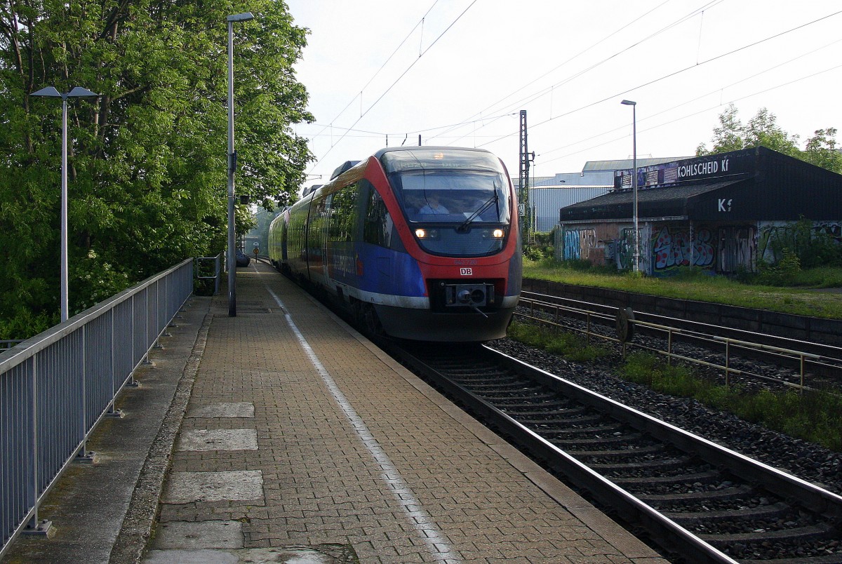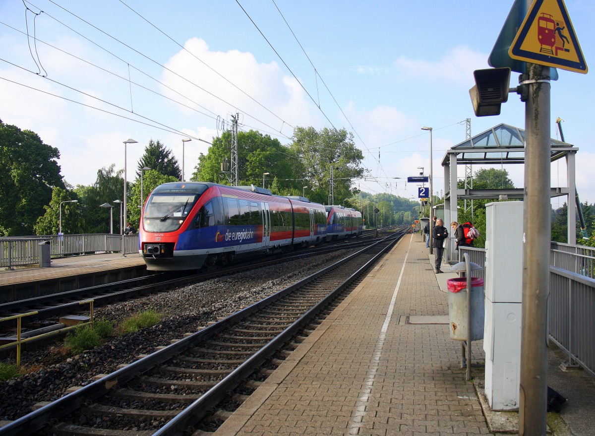 Zwei Euregiobahn (RB20) aus Heerlen(NL)-Stolberg-Altstadt-Düren kommt die Kohlscheider-Rampe hoch aus Richtung Herzogenrath und hält in Kohlscheid und fährt in Richtung Richterich,Laurensberg,Aachen-West bei Sonne und Wolken am Morgen vom 14.5.2014.