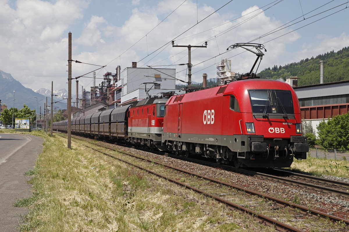 1016 004 und 1144 119 sind am 4.06.2014 mit einem Güterzug aus dem Bahnhof Leoben Donawitz ausgefahren.