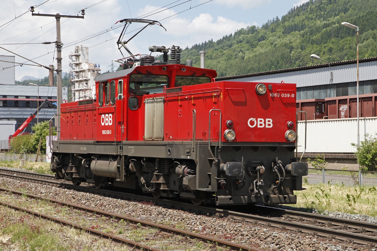1063 039 ist am 4.06.2014 zwischen Leoben Donawitz und Leoben Hauptbahnhof als Lokzug unterwegs.